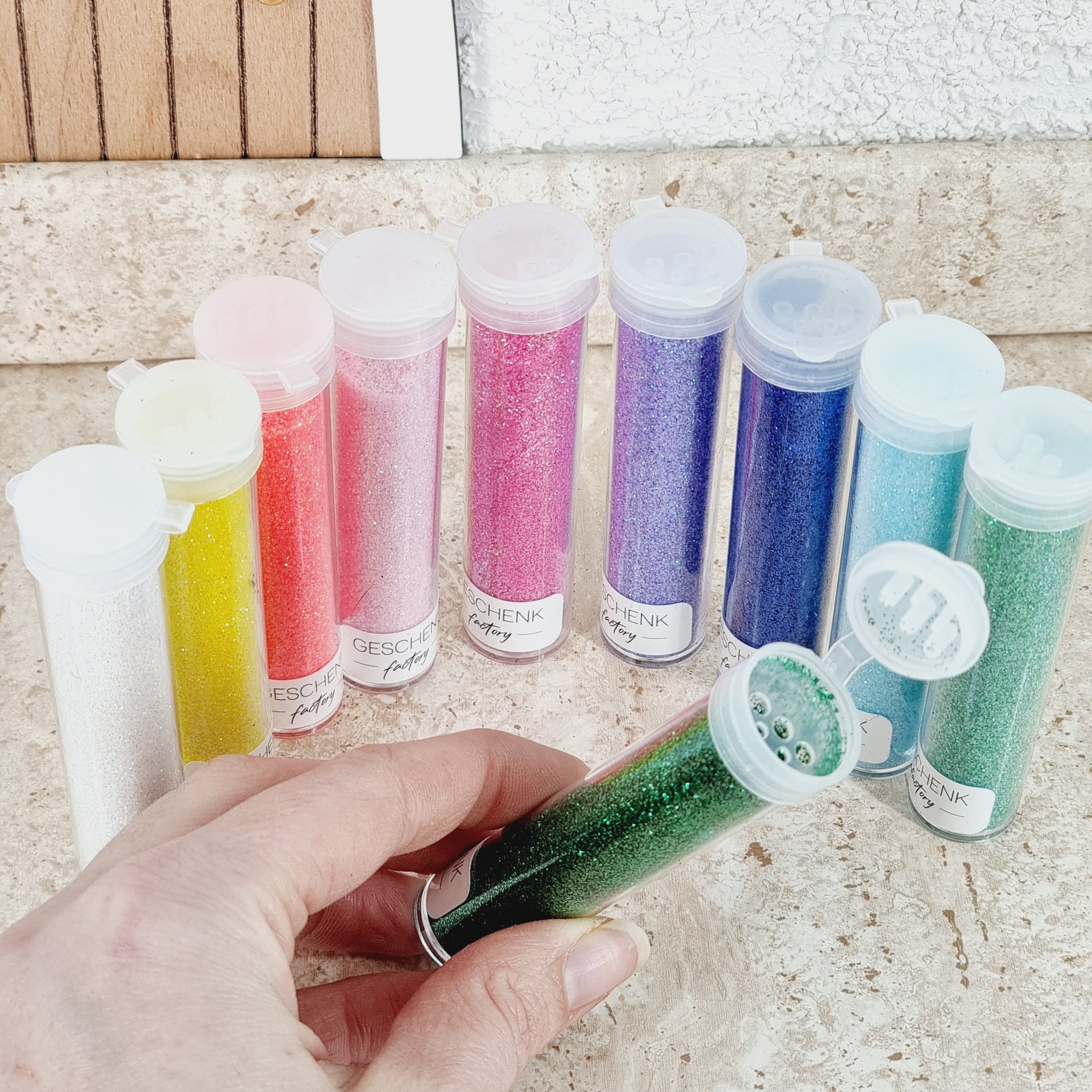 •  1 Tube mit ca. 10g Bio-Glitzer zum Nachfüllen (in 10 verschiedenen Farben erhältlich)